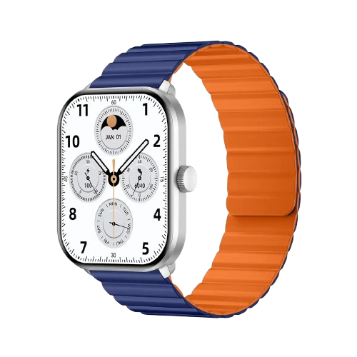 - بدنه نقرهای با بندهای سیلیکون مگنت آبی-نارنجی و سیلیکونی خاکستری