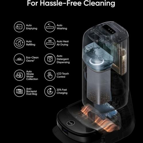 جاروبرقی رباتیک Eufy Omni S1 با فناوری Auto Washing، تی مخصوص خود را با فشار بالا و شوینده مخصوص تمیز می‌کند تا چربی‌ها و آلودگی‌های سطحی از بین بروند. از طرف دیگر، Auto Heated Air Drying پس از شستشو، تی را با هوای گرم 131°F (55°C) خشک می‌کند تا از ایجاد بوی نامطبوع و رشد باکتری‌ها جلوگیری شود. این فناوری کمک می‌کند تی همیشه تمیز، تازه و بهداشتی باقی بماند و برای مدت طولانی عملکرد خوبی داشته باشد.