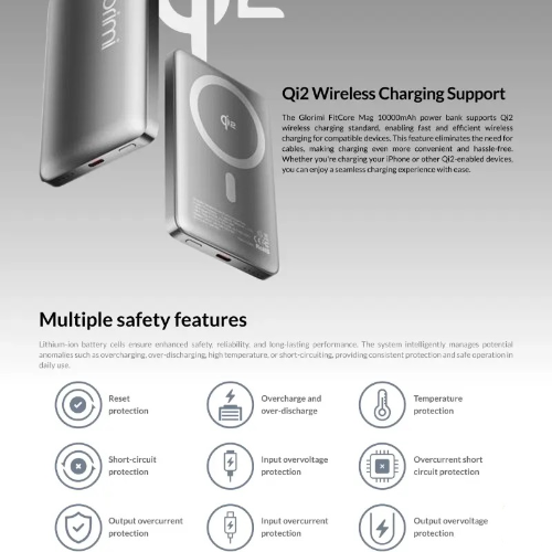 پاور بانک گلوریمی FitCore Mag 10000mAh ترکیبی از طراحی باریک، باتری قدرتمند، شارژ بی‌سیم مغناطیسی با فناوری Qi2 و شارژ سریع 20 واتی است. با توجه به ابعاد و وزنی که داره در کنار ویژگی هایی مانند مگ سیف و فناوری Qi2 می تونه گزینه ای ایمن برای استفاده های روزانه باشه
